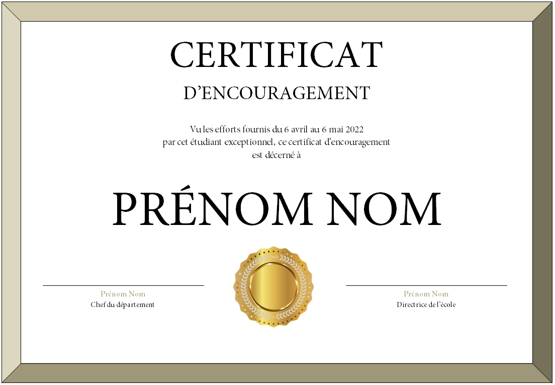 6 avril 2022Dans cette page, vous trouverez un modèle de certificat d’encouragement au format Word téléchargeable.