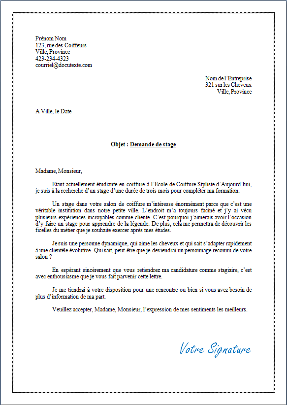 Modèle et exemple de lettre de demande de stage pour coiffeuse, coiffeur, pour un salon de coiffure.