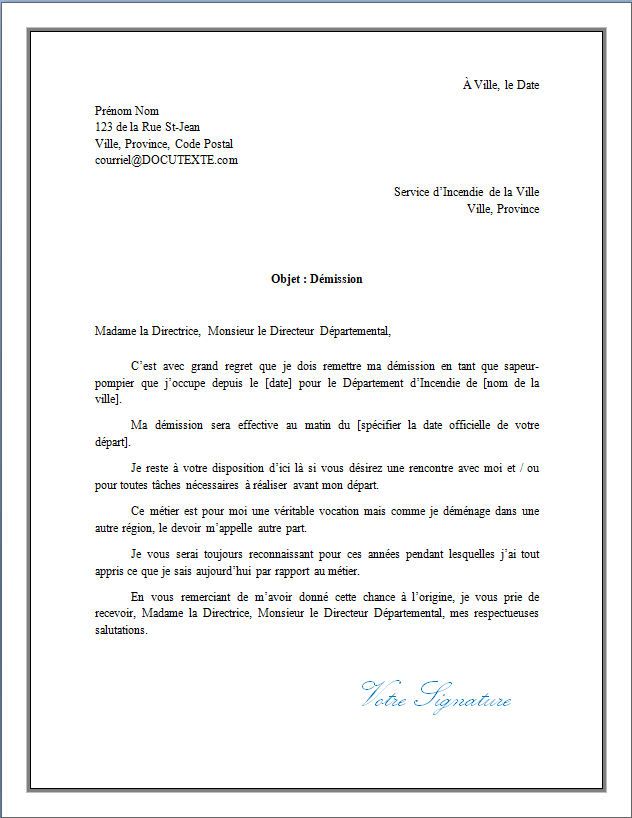 C’est avec grand regret que je dois remettre ma démission en tant que sapeur-pompier que j’occupe depuis le [date] pour le Département d’Incendie de [nom de la ville].