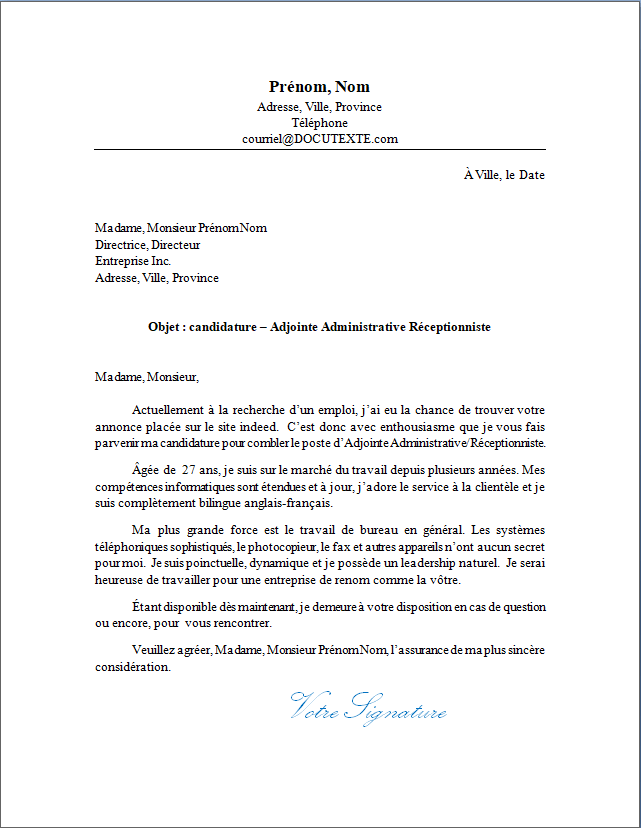 Actuellement à la recherche d’un emploi, j’ai eu la chance de trouver votre annonce placée sur le site indeed.  C’est donc avec enthousiasme que je vous fais parvenir ma candidature pour combler le poste d’Adjointe Administrative/Réceptionniste.