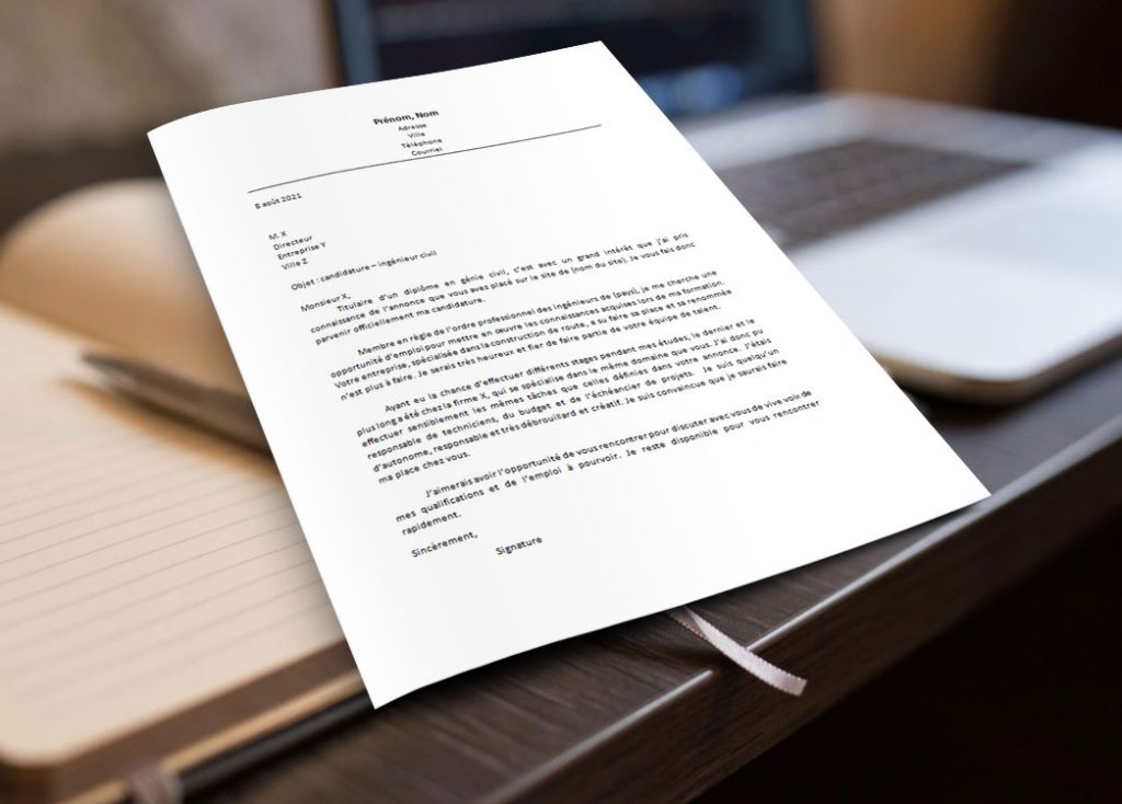 Membre en règle de l’ordre professionnel des ingénieurs de (pays), je me cherche une opportunité d’emploi pour mettre en œuvre les connaissances acquises lors de ma formation. Votre entreprise, spécialisée dans la construction de route, a su faire sa place et sa renommée n’est plus à faire. Je serais très heureux et fier de faire partie de votre équipe de talent.