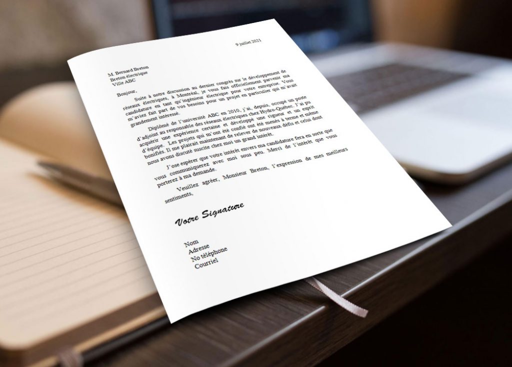 Suite à notre discussion au dernier congrès sur le développement de réseaux électriques, à Montréal, je vous fais officiellement parvenir ma candidature en tant qu’ingénieur électrique pour votre entreprise. Vous m’aviez fait part de vos besoins pour un projet en particulier qui m’avait grandement intéressé.