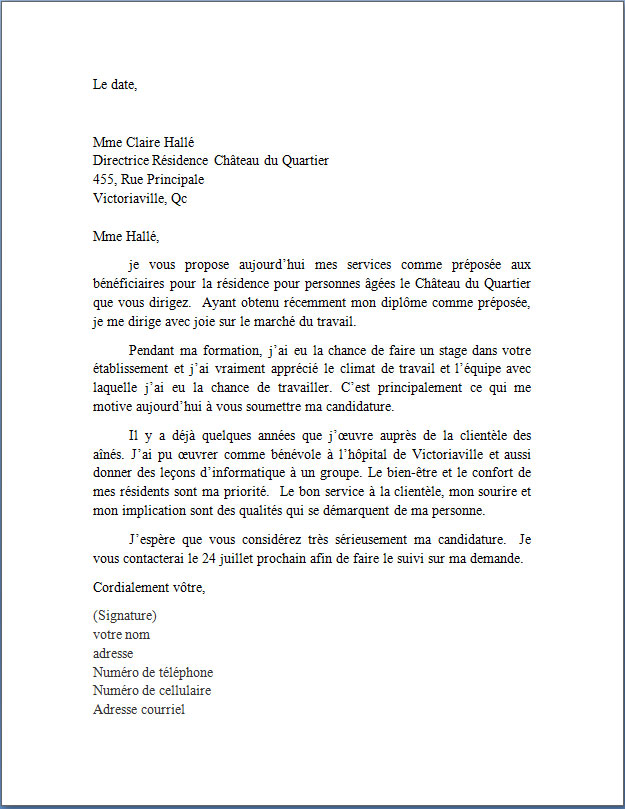 je vous propose aujourd’hui mes services comme préposée aux bénéficiaires pour la résidence pour personnes âgées le Château du Quartier que vous dirigez. Ayant obtenu récemment mon diplôme comme préposée, je me dirige avec joie sur le marché du travail.