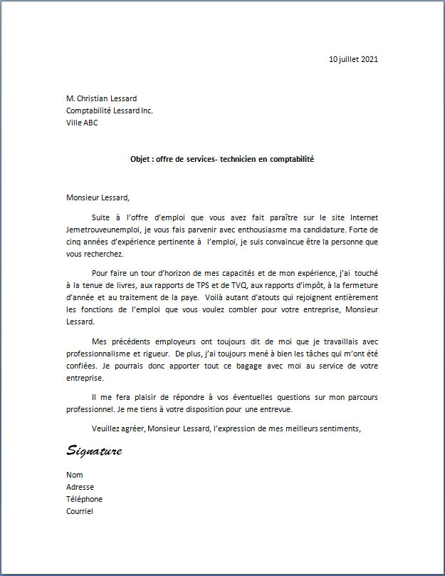 Pour faire un tour d’horizon de mes capacités et de mon expérience, j’ai  touché à la tenue de livres, aux rapports de TPS et de TVQ, aux rapports d’impôt, à la fermeture d’année et au traitement de la paye.  Voilà autant d’atouts qui rejoignent entièrement les fonctions de l’emploi que vous voulez combler pour votre entreprise, Monsieur Lessard.