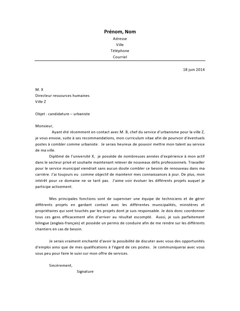 Ayant été récemment en contact avec M. B, chef du service d’urbanisme pour la ville Z, je vous envoie, suite à ses recommandations, mon curriculum vitae afin de pourvoir d’éventuels postes à combler comme urbaniste. Je serais heureux de pouvoir mettre mon talent au service de ma ville.